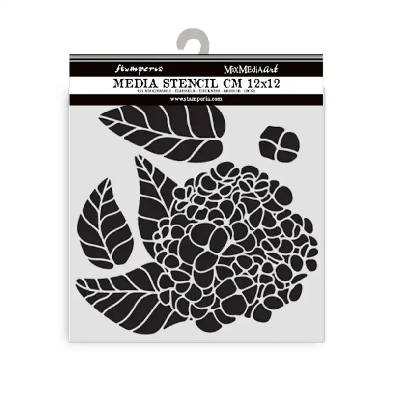 Stamperia Quiet Days. Stencil Mix Media Art 12 x 12 cm. HydrangeaIdeal para todos los proyectos, especialmente para Mix Media por su grosor de 0.5 mm.Las máscaras son elementos muy versátiles y que dan mucho juego, tanto en el mundo del scrapbooking como en el del Mixed Media. Con ellas puedes hacer un montón de cosas: crearte tus propios fondos, tus propios adornos, texturas… Puedes usarlas con tintas en spray, con tintas Distress y sus aplicadores, estarcido con purpurina, pigmentos o Perfect Pearls, aplicarles gesso o pasta de relieve… ¡Cuando empieces a cogerles el gusto no sabrás vivir sin ellas!