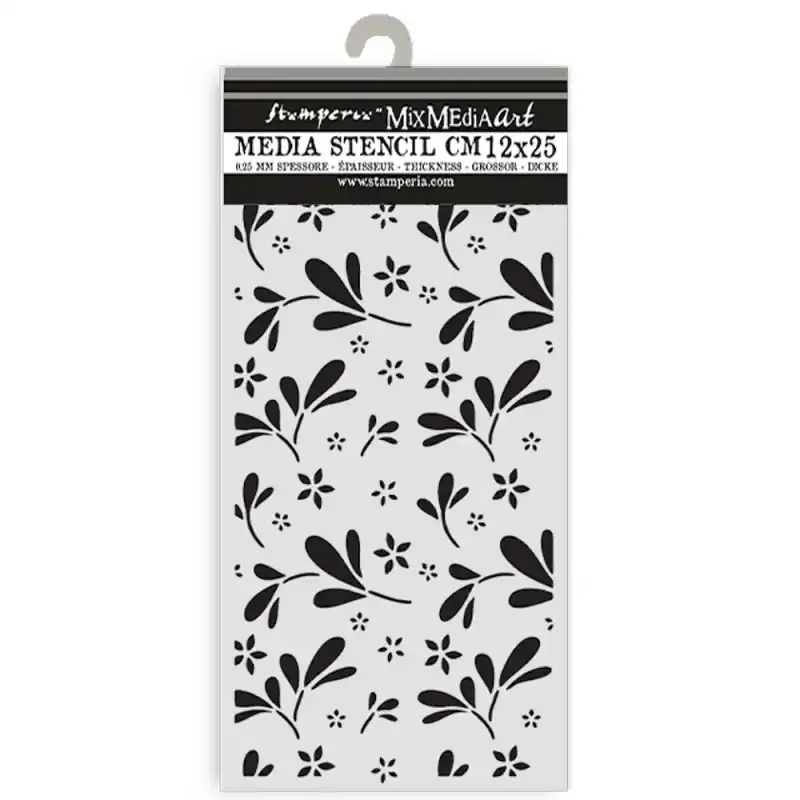 Stencil Stamperia Mix Media Art 25 x 12 cm. – Family Big Flower PatternIdeal para todos los proyectos, especialmente para Mix Media por su grosor de 0.5 mm.Las máscaras son elementos muy versátiles y que dan mucho juego, tanto en el mundo del scrapbooking como en el del Mixed Media. Con ellas puedes hacer un montón de cosas: crearte tus propios fondos, tus propios adornos, texturas… Puedes usarlas con tintas en spray, con tintas Distress y sus aplicadores, estarcido con purpurina, pigmentos o Perfect Pearls, aplicarles gesso o pasta de relieve… ¡Cuando empieces a cogerles el gusto no sabrás vivir sin ellas!