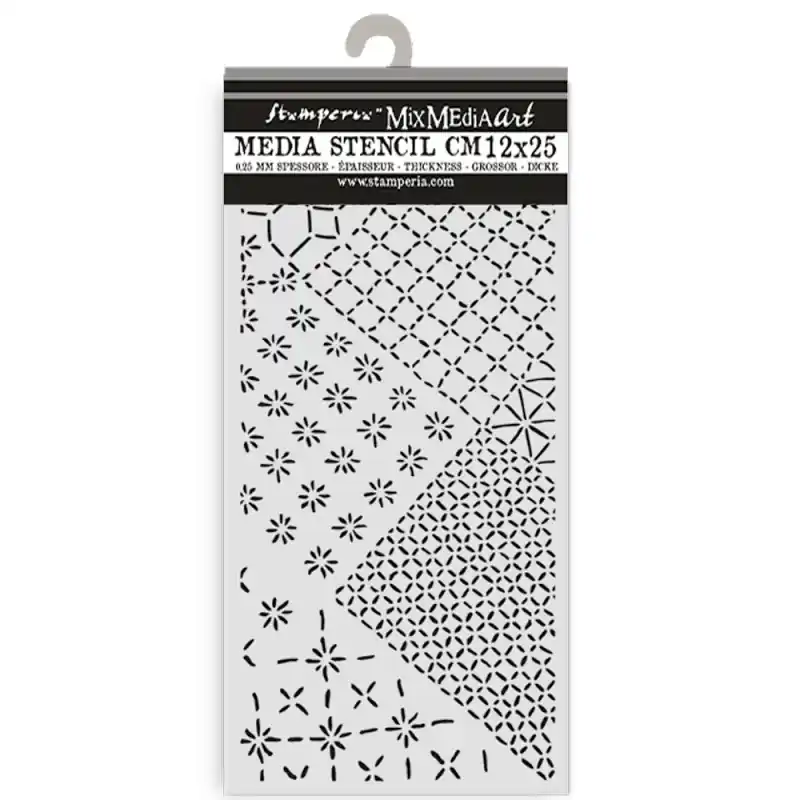 Stencil Stamperia Mix Media Art 25 x 12 cm. – Quiet Days Mixed TilesIdeal para todos los proyectos, especialmente para Mix Media por su grosor de 0.5 mm.Las máscaras son elementos muy versátiles y que dan mucho juego, tanto en el mundo del scrapbooking como en el del Mixed Media. Con ellas puedes hacer un montón de cosas: crearte tus propios fondos, tus propios adornos, texturas… Puedes usarlas con tintas en spray, con tintas Distress y sus aplicadores, estarcido con purpurina, pigmentos o Perfect Pearls, aplicarles gesso o pasta de relieve… ¡Cuando empieces a cogerles el gusto no sabrás vivir sin ellas!