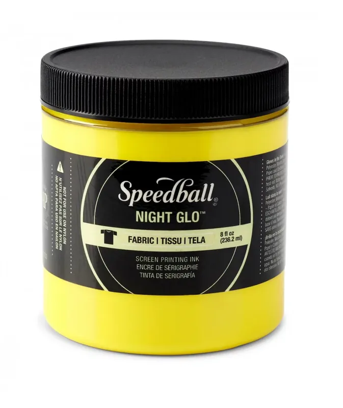 Tinta para serigrafía en tela de la marca Speedball night glo.Color amarillo.La tinta para serigrafía night glo Speedball brilla en la oscuridad.Puede usarse sobre cartón,tela y papel.No apta para nylon.No inflamable y sin disolventes dañinos.Envase de 237 ml.