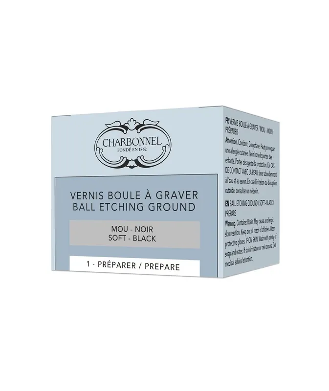 Barniz de bola para grabado Charbonell negro blando,el más usado.Aplicar en calienteLa bola de barniz negro opaca para bases de grabado proporciona bases de grabado en forma sólida.No se secan.Ofrecen líneas suaves y efectos de textura.Esta base de grabado se aplica mejor a placas calientes con tampón o rodillo.Como se trata de un barniz blando se puede utilizar el método del lápiz para hacer huellas en la plancha.Para lograr el método del lápiz, aplique una hoja de papel liviana sobre la plancha preparada. Luego use un lápiz duro para dibujar su diseño.Al retirar el papel se llevará consigo las líneas de tierra prensadas, quedando el dibujo en la plancha.Contenido: betún de Judea, resina de brea, sebo, colofonio, cera de abejas. Extracto seco: 52%Acabado: Satinado OpacoPeso aproximado : 40 gramos.